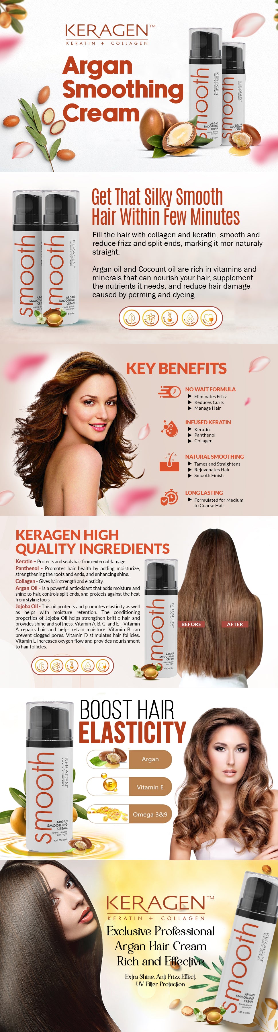 The Keragen Argan Smoothing Cream is a lightweight, nourishing formula designed to tame frizz and deliver silky-smooth hair. Infused with argan oil, jojoba oil, keratin, and vitamins, it hydrates deeply without weighing hair down—leaving it sleek, shiny, and manageable all day. Perfect for daily styling on damp or dry hair.