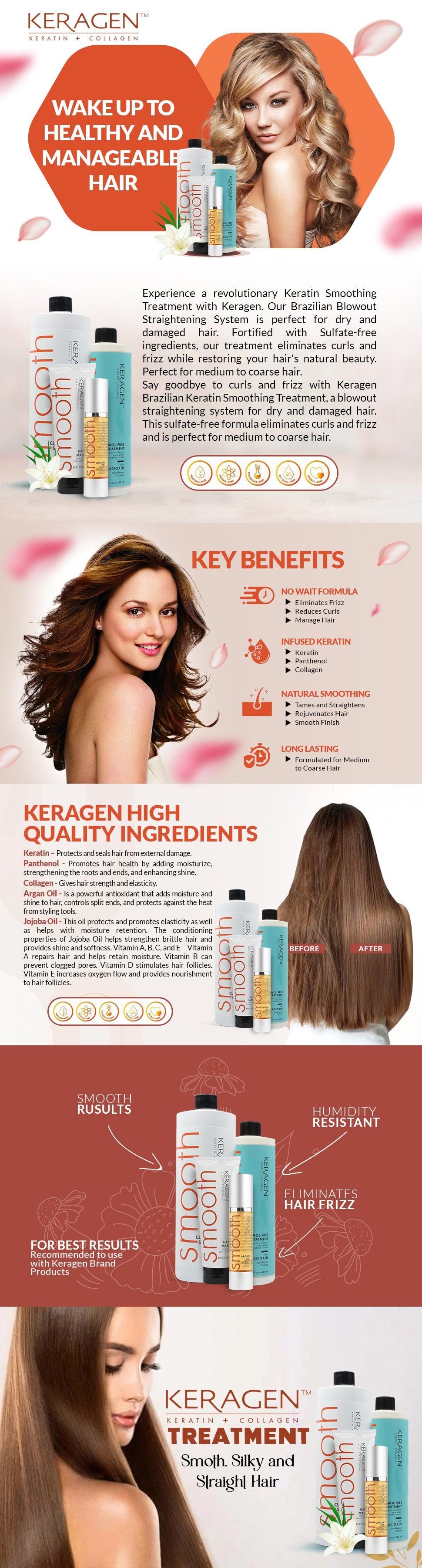 Experience the ultimate hair transformation with the KERAGEN Brazilian Keratin Treatment System - a complete professional smoothing kit designed for those who seek salon-quality results without compromising hair health. This advanced formaldehyde-free formula delivers exceptional frizz control and stunning smoothness while nurturing your hair's natural vitality.