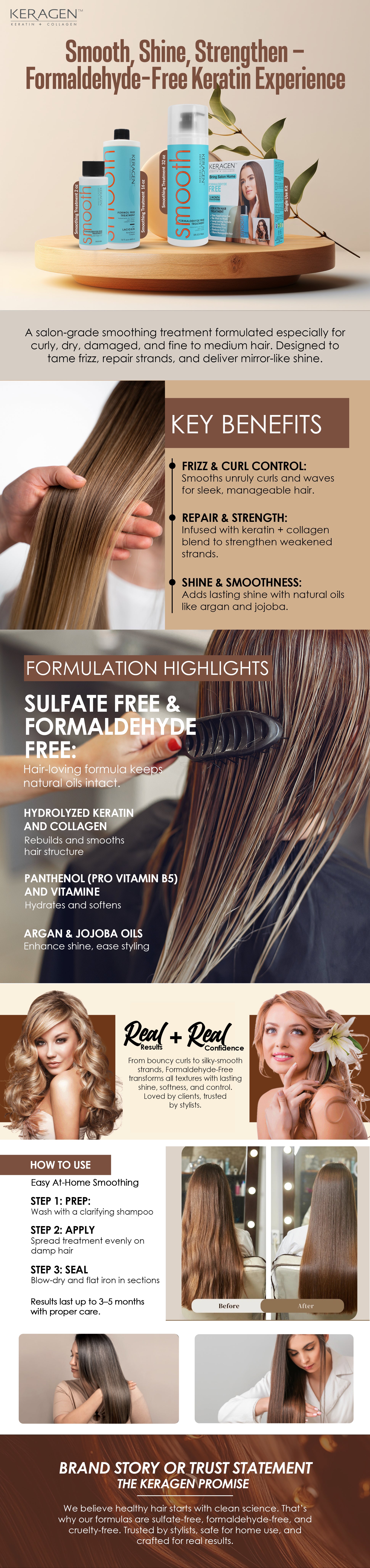 The Keragen Brazilian Keratin Smoothing Treatment is a formaldehyde-free blowout system that transforms frizzy, curly, or damaged hair into sleek, manageable strands. Infused with keratin and collagen, it nourishes deeply, repairs damage, and leaves hair with lasting shine and smoothness. Specially crafted for fine to medium hair types.