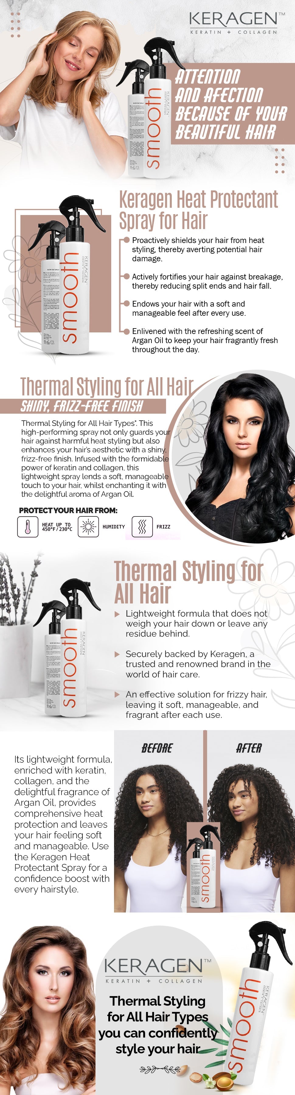 Brand: KERAGEN | Size: 8 oz | Protection: Up to 450°F | Hair Type: All Hair Types | Features: Sulfate-Free, Alcohol-Free, Paraben-Free | Fragrance: Light Argan Oil Scent